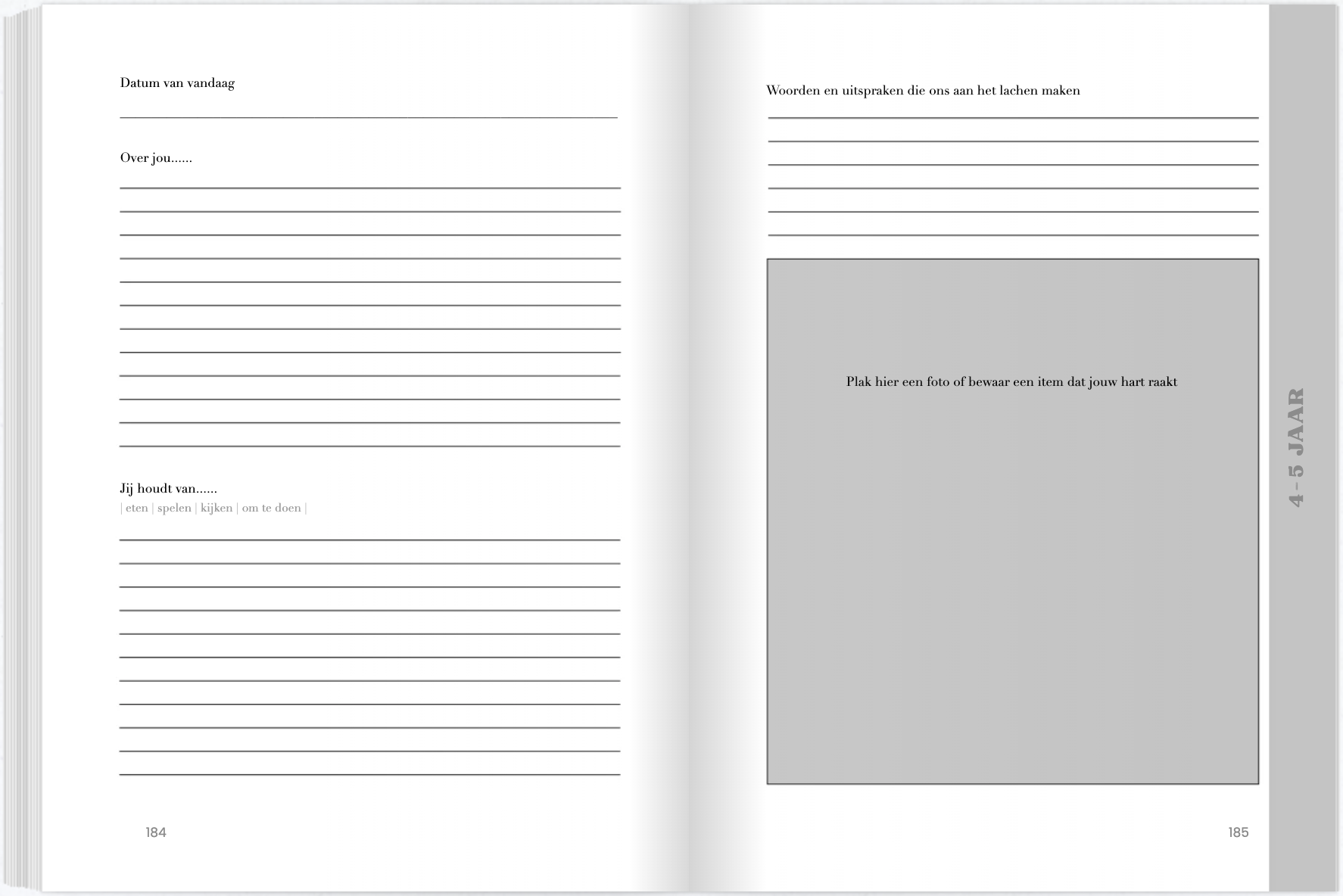 Vrije schrijfruimte: Genoeg ruimte om jouw unieke verhaal te vertellen, met subtiele prompts om je op weg te helpen.